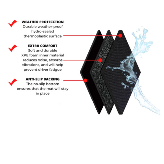 XPE mattan är uppbyggd i en 3- lagerskonstruktion med ett 100% vattentätt skick överst, XPE med dess foam-liknande struktur i mitten gör mattan mjukare och trevligare än en traditionell gummimatta och kan även dämpa en del ljud. I botten ligger ett lager antiglid som får mattan att ligga still.